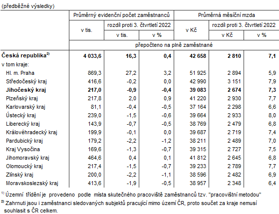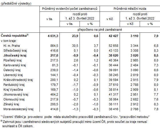 Ve 3. čtvrtletí 2023 se zvýšil počet zaměstnanců v ČR o 16,3 tis. (+0,4 %). Nejvíce vzrostl počet zaměstnanců v Praze (+3,2 %), přičemž mírné zvýšení počtu zaměstnanců bylo dále zaznamenáno jen v Plzeňském a Jihomoravském kraji. V ostatních krajích zaměstnanců ubylo. Nejvíce poklesl počet zaměstnanců v Pardubickém (−1,2 %) a Ústeckém kraji (−1,1 %). V Jihočeském kraji se snížil počet zaměstnanců ve srovnání se 3. čtvrtletím 2022 o 0,4 %, tedy o −0,9 tis.