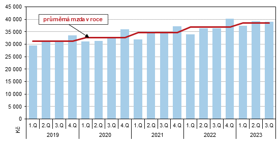 Průměrná měsíční mzda v národním hospodářství celé České republiky ve 3. čtvrtletí 2023 dosáhla výše 42 658 Kč, v meziročním srovnání činil přírůstek 2 810 Kč, v relativním vyjádření to bylo o 7,1 % více. Spotřebitelské ceny se však v ČR zvýšily za uvedené období o 8,0 %, reálně tedy mzda poklesla o 0,8 %.