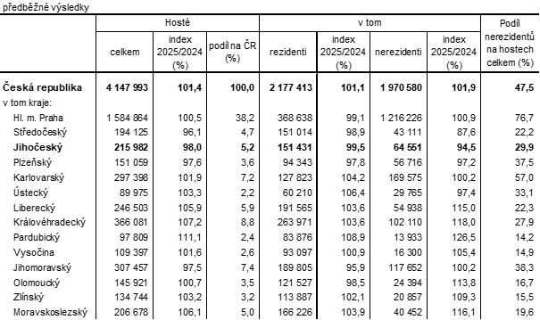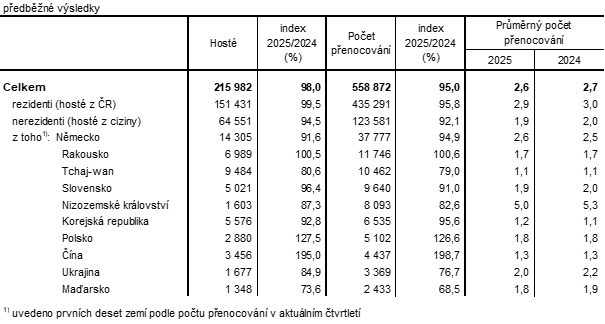 V HUZ celé České republiky se v 1. čtvrtletí 2025 oproti stejnému období minulého roku zvýšil počet ubytovaných hostů o 1,4 % a počet jejich přenocování o 0,6 %. Hostů z tuzemska se ubytovalo meziročně o 1,1 % více, ale počet jejich přenocování poklesl o 0,8 %. Nerezidentů přijelo do HUZ meziročně o 1,9 % více a počet jejich přenocování se zvýšil o 2,2 %.