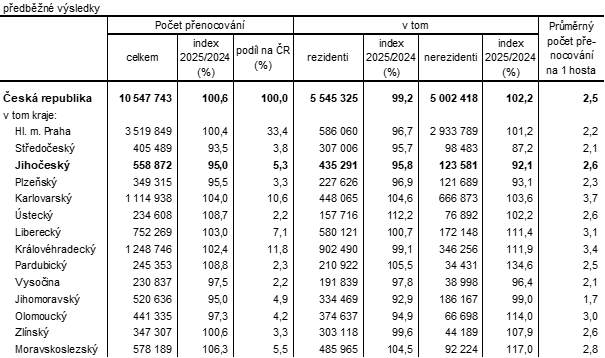 V 1. čtvrtletí 2025 se v HUZ Jihočeského kraje ubytovalo 151,4 tis. rezidentů na 435,3 tis. nocí a téměř 65 tis. nerezidentů na 123,6 tis. přenocování. V průměru se rezidenti zdrželi 2,9 noci a nerezidenti o jednu noc méně.