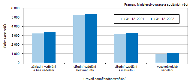 K 31. prosinci 2022 bylo v kraji necelých 68 % žadatelů o práci evidováno kratší dobu než šest měsíců. V rámci meziročního srovnání se snížil počet uchazečů o zaměstnání v kategorii 9 až 12 měsíců (−27,4 %) a 12 až 24 měsíců (−44,5 %).