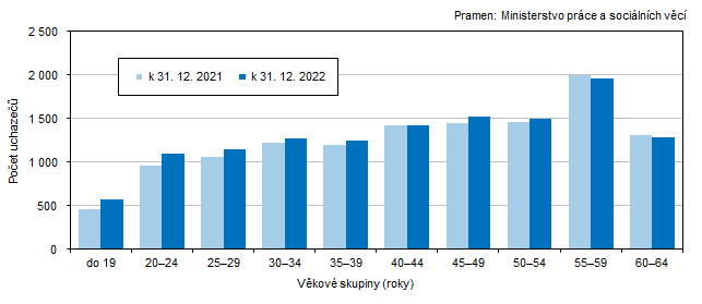 Mezi uchazeči o zaměstnání na jihu Čech převládali na konci prosince 2022 lidé ve věku 55 až 59 let (1 956 osob), kteří se na celkovém počtu uchazečů podíleli 14,9 %. Naopak ve věkové skupině do 19 let bylo osob hledajících zaměstnání nejméně (571). Průměrný věk uchazečů o zaměstnání byl ke konci prosince v kraji 43,1 let. Meziročně se snížil o 0,7 roku.