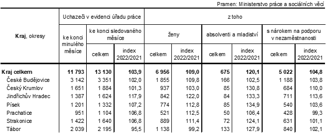 Meziročně vzrostl počet uchazečů o zaměstnání v evidenci úřadu práce v Jihočeském kraji o 3,9 %. V rámci meziokresního srovnání došlo ke snížení počtu uchazečů o zaměstnání pouze v okrese Tábor (−4,5 %).
