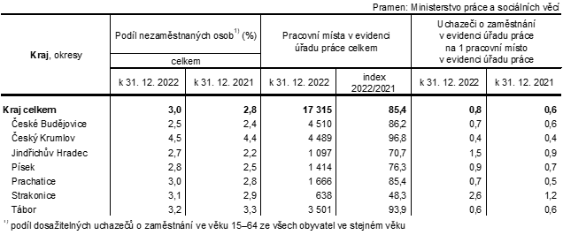 V Jihočeském kraji bylo na úřadech práce ke konci prosince 2022 evidováno celkem 13 130 uchazečů o zaměstnání. Podíl nezaměstnaných osob činil 3,0 % a mezi kraji byl čtvrtý nejnižší. Oproti konci listopadu výrazně vzrostl počet uchazečů (+11,3 %) a snížil se počet volných pracovních míst (−2,1 %).