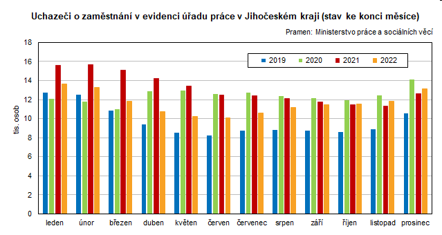 Ke konci měsíce prosince bylo na území Jihočeského kraje evidováno 13 130 uchazečů o zaměstnání, z toho dosažitelných bylo 11 868 osob. Meziměsíčně se počet nezaměstnaných osob v kraji zvýšil (+11,3 %). Obdobný trend byl zřejmý ve všech okresech kraje. V porovnání s minulým měsícem zaznamenal nejvyšší nárůst počtu uchazečů o zaměstnání okres Jindřichův Hradec (+17,1 %).