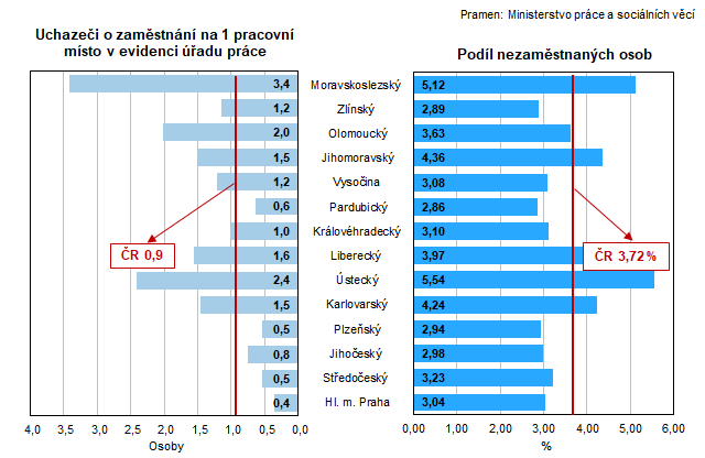 Nejpříznivější poměr mezi uchazeči o zaměstnání a volnými pracovními místy vykázalo v rámci mezikrajského srovnání hlavní město Praha (0,4 uchazeče na 1 volné pracovní místo). Nejméně příznivá situace byla v Moravskoslezském kraji, ve kterém na 1 pracovní místo připadalo 3,4 uchazečů.