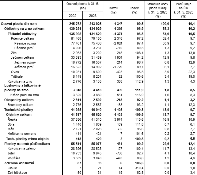 Osevní plocha obilovin se oproti minulému roku snížila o 4,3 tis. ha (−3,1 %). Na menší ploše se letos pěstuje pšenice i ječmen (−2,3 tis. ha, resp. −1,9 tis. ha), menší je také plocha ovsa, naopak rozšířeny byly plochy žita a kukuřice na zrno, stejná je plocha tritikale. Úbytek osevních ploch v kraji zaznamenaly okopaniny, zejména brambory (−188 ha) a pícniny na orné půdě (−434 ha), především jetel a vojtěška. Na větší ploše jsou letos pěstovány luskoviny a bílkovinné plodiny na zrno (+469 ha) a výrazně byly rozšířeny plochy technických plodin (+4,1 tis. ha), především řepky (+4,0 tis. ha). Zvětšily se i plochy sóji a hořčice na semeno, naopak poněkud omezeny byly plochy máku (−92 ha).