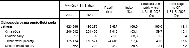 K 31. 5. 2023 obhospodařovali jihočeští zemědělci zemědělskou půdu o výměře 426,3 tis. ha, což je sice o 0,6 % více než minulý rok, ale o 14,6 tis. ha méně (−3,3 %) než před dvaceti lety. Většinu zemědělské půdy v kraji tvoří orná půda, nyní s podílem 59,7 %, a trvalé travní porosty s podílem 40,0 %. Ačkoli meziroční srovnání ukazuje rozšíření ploch orné půdy na jedné straně a úbytek trvalých travních porostů na straně druhé, dosavadní vývojový trend byl opačný. Dlouhodobě ploch orné půdy ubývá a plocha trvalých travních porostů se rozšiřuje.