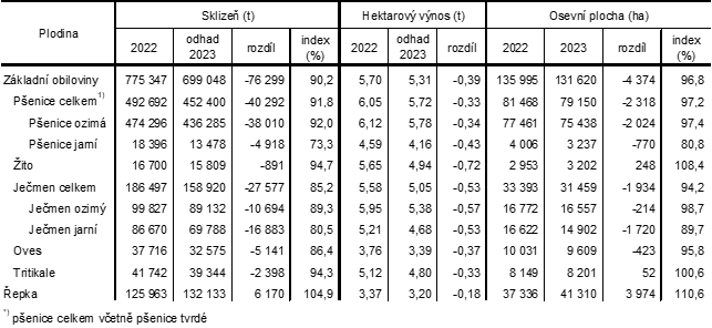 V Jihočeském kraji se podle červnového odhadu výnosů a sklizně předpokládá, že letošní produkce základních obilovin bude v porovnání s nadprůměrnou sklizní předchozího roku téměř o 10 % nižší. Odhadovaný pokles sklizně je zaviněn úbytkem osevních ploch základních obilovin (−3,2 %) a podprůměrným a oproti loňsku také horším hektarovým výnosem.
