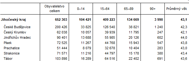 Z celkového počtu obyvatel žilo v roce 2022 na území kraje 16,0 % dětí (ve věku do 14 let), podíl obyvatel v produktivním věku byl celkem 62,7 % a ve věku 65 a více let bylo celkem 21,3 % obyvatel. V kraji žilo k 31. prosinci 2022 téměř 4 tisíce obyvatel, kteří již oslavili svoje devadesáté a případně další narozeniny. Průměrný věk obyvatel kraje byl 43,1 let (muži 41,8 let, ženy 44,3 let). Na území kraje bylo v roce 2022 stále věkově nejmladší obyvatelstvo v okrese Český Krumlov (42,1 let), naopak nejstarší obyvatelstvo měl okres Písek (44,0 let).