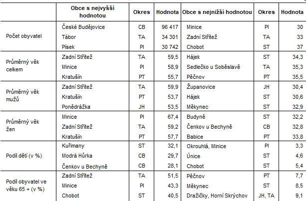 Průměrný věk byl v roce 2022 v Jihočeském kraji 43,1 let (muži 41,8 let; ženy 44,3 let). Nejmladší obyvatelstvo žilo v roce 2022 v obci Hájek na Strakonicku (34,3 let). Naopak věkově nejstarší obyvatelé byli v obci Zadní Střítež v okrese Tábor (59,5 let). Nejvýraznější rozdíl mezi průměrným věkem mužů a žen byl zjištěn v obci Minice na Písecku, kde byli muži o 16,0 roku mladší než ženy. Naopak v obci Budyně na Strakonicku byly v roce 2022 ženy o 12,3 let mladší než muži.