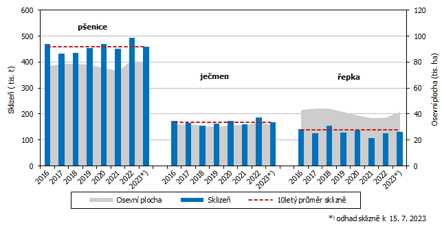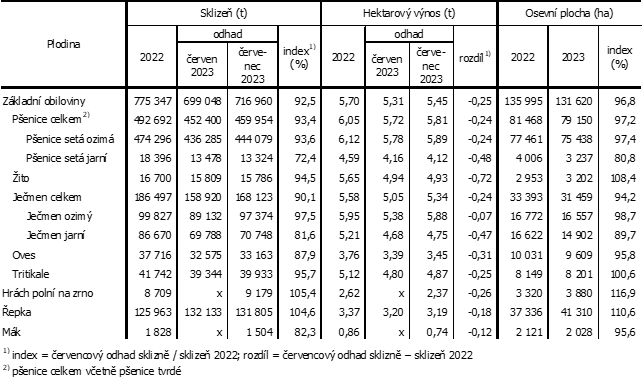 - Odhady sklizní - červenec 2023Hektarový výnos (v t/ha) a celková sklizeň (propočet z odhadovaného hektarového výnosu a osevní plochy), obhospodařovaná zemědělská půda. Porovnání s předchozím rokem.