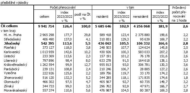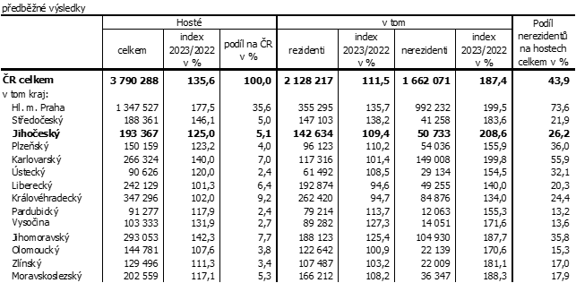Jihočeský kraj se v pomyslném regionálním žebříčku umístil počtem hostů i jejich přenocování na sedmém a šestém místě. K celorepublikovým výsledkům přispěl 5 %.