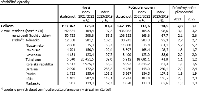 V porovnání se stejným obdobím minulého roku se počet ubytovaných hostů ve všech krajích zvýšil, zejména zásluhou přírůstku nerezidentů V porovnání s ním byl přírůstek počtu rezidentů podstatně nižší. V Libereckém a Královéhradeckém kraji, kde byla loňská zimní sezóna mimořádně zdařilá, dokonce počet rezidentů poklesl. Tyto kraje spolu s Olomouckým a Zlínským krajem zaznamenaly navíc mírný meziroční pokles počtu přenocování vlivem nižšího počtu přenocování rezidentů.