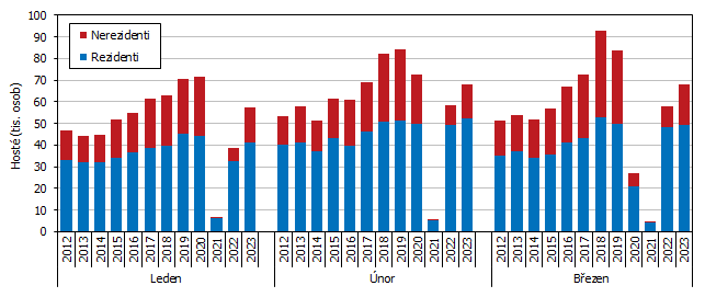 V 1. čtvrtletí bývá podle měsíčních hodnot nejmenší turistický ruch v lednu. I přes vysoký meziroční lednový nárůst počtu hostů to aktuální hodnoty potvrdily. V únoru a březnu bývá návštěvnost zásluhou zimních prázdnin a zimní lyžařské sezóny vyšší. Počet tuzemských hostů v těchto dvou měsících předpandemickou úroveň již vyrovnal, počet zahraničních hostů, i přes téměř dvojnásobný meziroční nárůst, na ni dosáhl jen z poloviny.