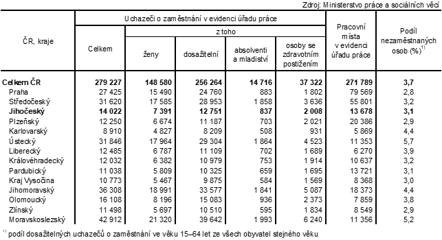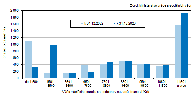 Na jedno volné pracovní místo v evidenci úřadu práce připadal k 31. prosinci 2023 v celé ČR 1 uchazeč. Nejpříznivější poměr mezi uchazeči o zaměstnání a volnými pracovními místy vykázalo v rámci mezikrajského srovnání hlavní město Praha (0,3 uchazeče na 1 volné pracovní místo). Nejméně příznivá situace byla v Moravskoslezském kraji, ve kterém na 1 pracovní místo připadalo 3,8 uchazečů.