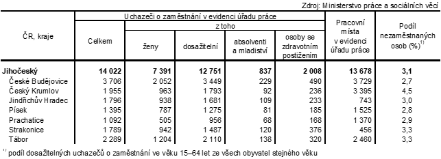 Na území Jihočeského kraje bylo ke konci měsíce prosince evidováno 14 022 uchazečů o zaměstnání, z toho dosažitelných bylo 12 751 osob. V porovnání s minulým měsícem došlo v kraji k nárůstu počtu nezaměstnaných osob, a to o 13,6 %. Obdobný trend vykazovaly všechny jihočeské okresy, zejména okres Prachatice (+26,5 %).