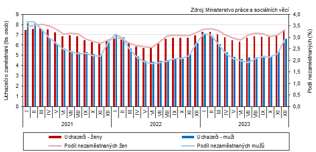 Ke konci roku 2023 byl v ČR podíl nezaměstnaných osob 3,7 %. V rámci mezikrajského srovnání byla zaznamenána nejvyšší nezaměstnanost v krajích Ústeckém a Moravskoslezském. Meziměsíčně se nezaměstnanost mírně zvýšila ve všech krajích ČR.