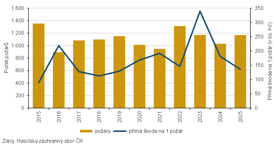 V meziročním srovnání se zvýšil počet požárů v Česku o 7,9 %. Také přímá škoda způsobená požáry byla podstatně vyšší (+42,1 %). Meziroční snížení počtu požárů se týkalo jen Libereckého kraje (–2,7 %), v ostatních krajích byly počty požárů meziročně vyšší, zejména v krajích Zlínském (+22,8 %) a Karlovarském (+21,0 %). Také v Jihočeském kraji bylo v roce 2025 více požárů ve srovnání s předešlým rokem (+13,4 %).