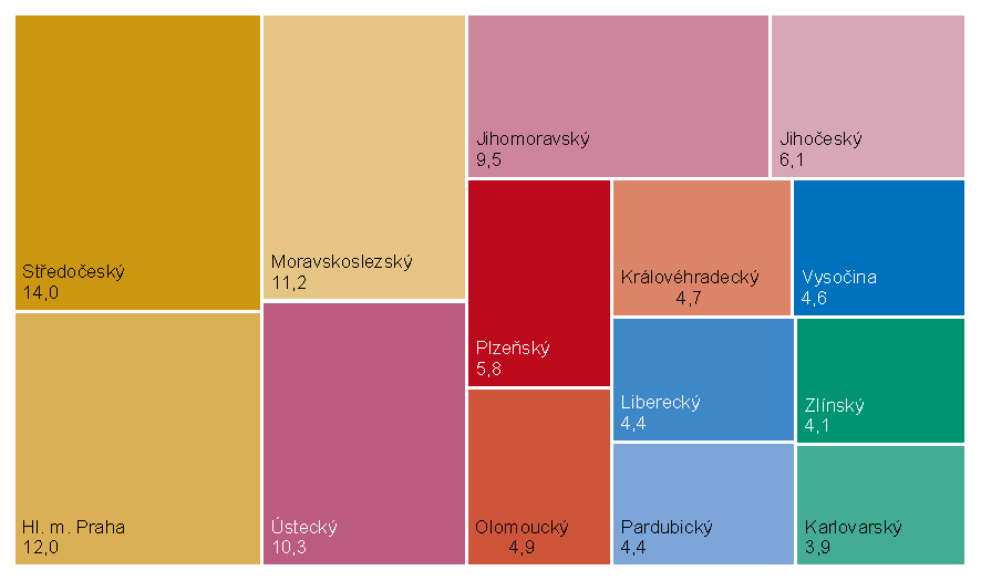 Nejvíce požárů vzniklo ve Středočeském kraji (2 670), naopak nejméně jich bylo zaznamenáno v Karlovarském kraji (749). V relativním vyjádření (přepočet na 1 000 obyv.) byly tyto hodnoty spíše opačné. V Karlovarském kraji byla tato hodnota nejvyšší (2,6 požáru na 1 000 obyv.), nejnižší ve Zlínském kraji (1,4 požáru na 1 000 obyv.). V Jihočeském kraji činil tento relativní údaj 1,8 požáru.