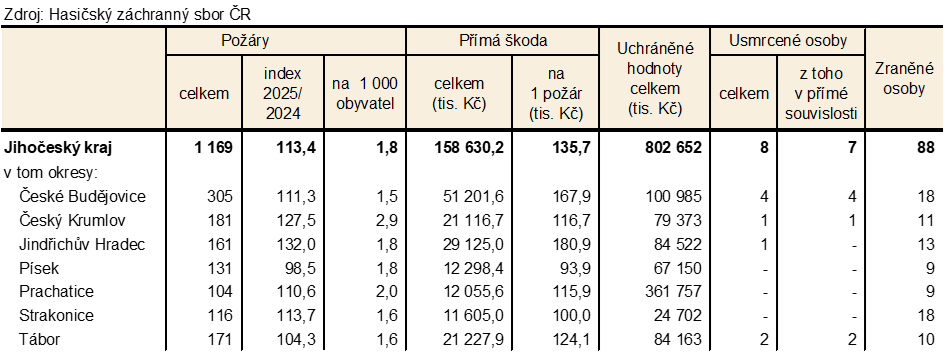 Podle zveřejněných údajů Hasičského záchranného sboru ČR vzniklo v roce 2025 v Jihočeském kraji celkem 1 169 požárů, při kterých bylo usmrceno osm osob a 88 lidí se zranilo. Přímá škoda způsobená požáry dosáhla v kraji částky 158,6 mil. Kč a uchráněné hodnoty byly vyčísleny na 802,7 mil. Kč.