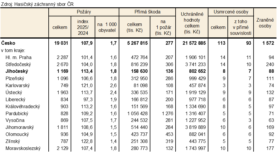 Jihočeský kraj se na celkovém počtu vzniklých požárů v Česku v roce 2025 podílel z 6,1 % a v rámci mezikrajského srovnání se umístil na 9. nejvyšší příčce. Na území kraje vzniklo celkem 1 169 požárů, v porovnání s minulým rokem došlo k nárůstu o 13,4 %. Přímá škoda způsobená požáry se meziročně snížila o 15 % na celkovou částku 158,6 mil. Kč. Přímá škoda na 1 požár byla vyčíslena na 135,7 tis. Kč.