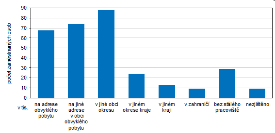 Vyjížďku za prací v jiném okrese kraje vyznačilo ve sčítacích formulářích přes 24 tis. zaměstnaných osob, do jiného kraje vyjíždělo do zaměstnání v době sčítání téměř 13 tis. osob. Vyjíždění do zaměstnání v zahraničí uvedlo ve sčítacích tiskopisech přes 9 tis. osob a bez stálého pracoviště bylo zaměstnáno 29 tis. osob.