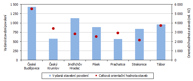 Nejvyšší měrou se na celkové orientační hodnotě staveb kraje podílel okres České Budějovice (23,9 %). Nejnižší hodnota povolených staveb byla vykázána na Strakonicku, které se na hodnotě kraje se podílelo pouze z 9,3 %.