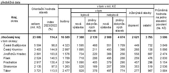 V Jihočeském kraji v roce 2023 dosáhla orientační hodnota staveb 23,0 mld. Kč a proti předchozímu roku vzrostla o 14,4 %. Také průměrná hodnota na jedno stavební povolení zaznamenala poměrně výrazný meziroční nárůst (+21,3 %) a činila 3 596 tis. Kč. I přesto byla nejnižší v celém Česku a jako jediná nedosáhla hodnoty 4 mil. Kč. Ve srovnání s republikovým údajem byla průměrná hodnota stavby na 1 povolení v kraji nižší o 4,2 mil. Kč.
