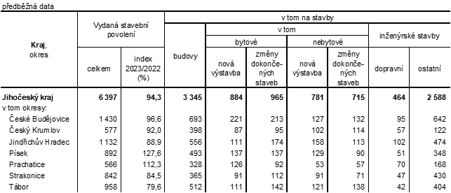 V roce 2023 vydaly stavební úřady v Jihočeském kraji 6 397 stavebních povolení, tedy o 5,7 % méně proti předchozímu roku. Předpokládaná orientační hodnota povolených staveb v kraji činila 23,0 mld. Kč a byla meziročně o 14,4 % vyšší. Průměrná hodnota na jedno stavební povolení dosáhla 3 596 tis. Kč.