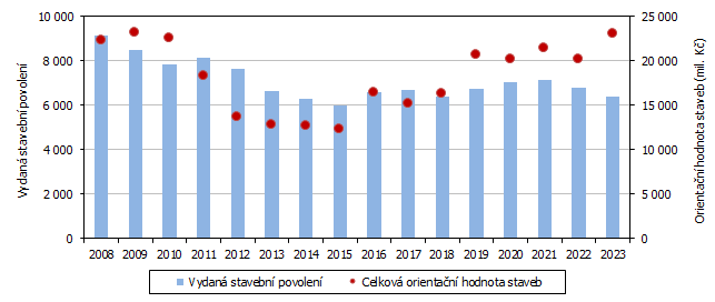 Orientační hodnota staveb (OHS), na které bylo v roce 2023 vydáno stavební povolení, dosáhla v Česku 601,7 mld. Kč a meziročně vzrostla o necelých 17 %. Téměř ve všech krajích Česka byl zaznamenán nárůst orientační hodnoty povolených staveb oproti roku 2022, nejvýrazněji se to projevilo v Olomouckém kraji, kde se OHS zvýšila o více než polovinu. Ve čtyřech krajích došlo k meziročnímu poklesu OHS, nejvýraznější byl v Královéhradeckém kraji, kde se OHS snížila o více než čtvrtinu.
