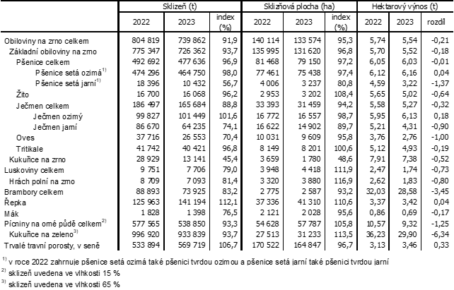 Tab. 1 Sklizeň vybraných zemědělských plodin v Jihočeském kraji v roce 2023 a její srovnání s rokem 2022