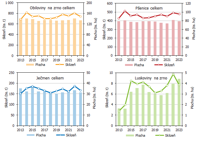 Obilovin celkem sklidili jihočeští zemědělci v roce 2023 oproti předchozímu roku o 8,1 % méně kvůli slabšímu výnosu a úbytku sklizňových ploch. Nižší byla úroda jednotlivých druhů základních obilovin s výjimkou ječmene ozimého, jehož sklizeň navzdory menší ploše meziročně vzrostla a byla zásluhou rekordního výnosu nejvyšší v historii kraje. Pšenice ozimé, naší nejvýnosnější základní obiloviny a nejrozšířenější plodiny vůbec, sklidili v kraji o 2,0 % méně než v roce 2022. Tento pokles byl i přes vyšší výnos způsoben úbytkem ploch.