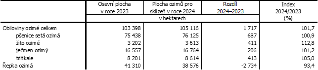 Současně s výsledky sklizně byly zjišťovány osevní plochy ozimů. Koncem listopadu 2023 byly v Jihočeském kraji plochy ozimých obilovin celkem v meziročním srovnání o 1,7 % vyšší. Rozšířeny byly zejména plochy pšenice seté ozimé, žita a tritikale. Výměra řepky byla podle údajů ozimu redukována o 6,6 %.