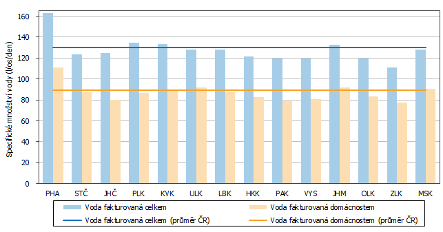 Specifické množství vody fakturované domácnostem na jihu Čech dosáhlo 80,2 l/os/den a bylo mezi kraji třetí nejnižší. Republikový průměr byl 89,4 l/os/den a překonaly ho čtyři kraje. Největší spotřebu vody vykázaly domácnosti v Praze (111,2 l/os/den), naopak nejméně vody spotřebovaly domácnosti ve Zlínském kraji (77,2 l/os./den). Ve všech krajích denní spotřeba vody na osobu meziročně poklesla.
