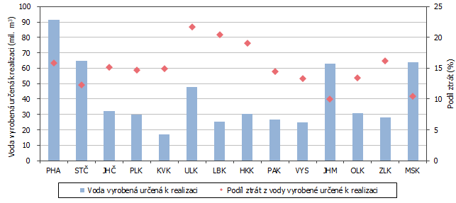 Graf 1 Objem vyrobené vody určené k realizaci a její ztráty podle krajů v roce 2022