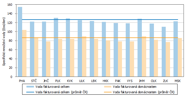 Specifické množství vody fakturované domácnostem na jihu Čech dosáhlo 78,1 l/os/den a bylo mezi kraji druhé nejnižší. Republikový průměr činil 86,7 l/os/den a překonaly ho tři kraje. Největší spotřebu vody vykázaly domácnosti v Praze (103,8 l/os/den), naopak nejméně vody spotřebovaly domácnosti ve Zlínském kraji (77,1 l/os./den). Ve všech krajích denní spotřeba vody na osobu meziročně poklesla.