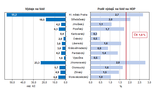 V roce 2023 dosáhly celkové výdaje na výzkum a vývoj 139,7 miliardy korun a meziročně vzrostly o 4,8 %. K největšímu meziročnímu nárůstu celkového objemu výdajů na výzkum a vývoj došlo v Ústeckém kraji (+32,2 %). Dlouhodobě nejdůležitějším centrem českého výzkumu a vývoje však nadále zůstává Praha, v níž bylo v roce 2023 realizováno 39,5 % celkových výdajů na VaV v celém Česku 55,2 mld. Kč). S velkým odstupem za ní následovaly kraje Jihomoravský s 16,7 % a Středočeský s 13,2 %. Při přepočtu na regionální hrubý domácí produkt (HDP) však dosáhl nejvyšší hodnoty Jihomoravský kraj (2,8 %), v Praze a Středočeském kraji to bylo 2,7 % a 2,0 % HDP vytvořeného v příslušném kraji. Naproti tomu v Karlovarském kraji podíl činil jen 0,3 % HDP, byť zde meziročně celkové výdaje vzrostly o více než čtvrtinu.
