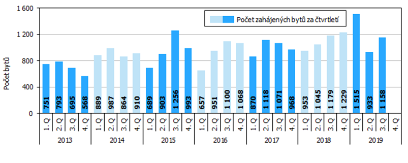 Jihomoravský kraj se počtem 3 606 bytů, jejichž výstavba byla v 1. až 3. čtvrtletí letošního roku zahájena, řadí na 3. nejvyšší příčku za Hl. město Prahu a Středočeský kraj. Tento počet bytů představuje 12,4 % republikového celku. V porovnání se stejným obdobím roku 2018 vzrostla zahájená výstavba v kraji o 13,5 %, tj. o 429 bytů. Téměř dvojnásobně meziročně vzrostla zahájená výstavba v Libereckém kraji (o 680 bytů), pokles byl zaznamenán ve čtyřech krajích. Zahájená výstavba bytů v Jihomoravském kraji vzrostla v rodinných domech o 8,9 % (o 151 bytů), v bytových domech vzrostla o 69,7 % (o 470 bytů).
