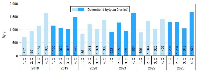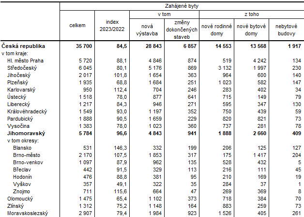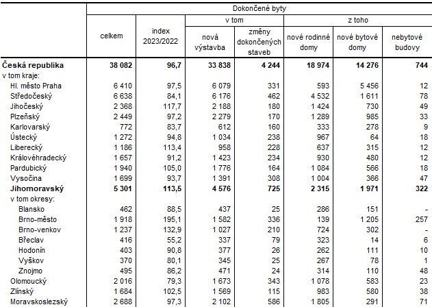 V roce 2023 bylo v Jihomoravském kraji dokončeno celkem 5 301 bytů, což je o 632 bytů více než za rok 2022. Přes třetinu z nich je v okrese Brno‑město, necelá čtvrtina připadá na Brno‑venkov. Celkem byla ve sledovaném období zahájena výstavba 5 784 bytů, z toho 46 % v nových bytových domech.