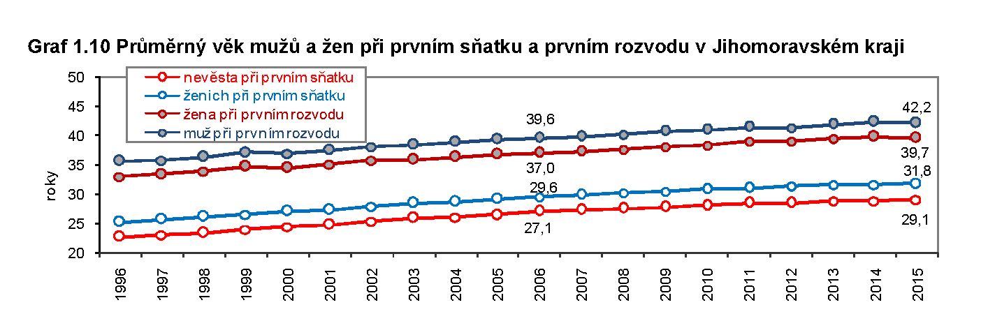 Průměrný věk mužů a žen při prvním sňatku a prvním rozvodu