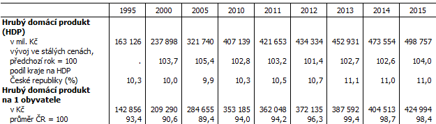 Vývoj regionálního HDP ve stálých cenách roku 1995 je obsahem grafu 2. HDP v kraji byl v roce 2008 proti roku 1995 o 49,8 % vyšší a až rok 2011 znamenal překročení této hranice (nárůst o 51,3 %). V rámci ČR v roce 2008 zvýšení dosáhlo 53,4 %, tento stav byl překonán až v roce 2014. Nárůst HDP vyjádřený ve stálých cenách roku 1995 byl v kraji až do roku 2011 ve srovnání s vývojem v ČR vždy nižší, v letech 2012 až 2015 však byl republikový průměr převýšen.