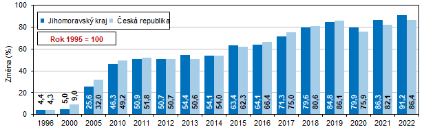 Vývoj regionálního HDP ve stálých cenách roku 1995 ukázal, že HDP v kraji v roce 2008 byl proti roku 1995 o 51,0 % vyšší. Po „krizovém“ roku 2009 (nárůst proti roku 1995 o 42,5 %) až rok 2013 v Jihomoravském kraji znamenal překročení této hranice (nárůst o 54,4 %). V rámci ČR v roce 2008 zvýšení dosáhlo 52,8 %, tento stav byl překonán až v roce 2014. Nárůst HDP vyjádřený ve stálých cenách roku 1995 byl v kraji ve srovnání s vývojem v ČR většinou nižší. Výjimkou byly roky 1996, 2013 až 2015 a roky 2020 až 2022 (v roce 2012 byly přírůstky shodné). V roce 2022 byl HDP v Jihomoravském kraji oproti roku 1995 o 91,2 % vyšší.