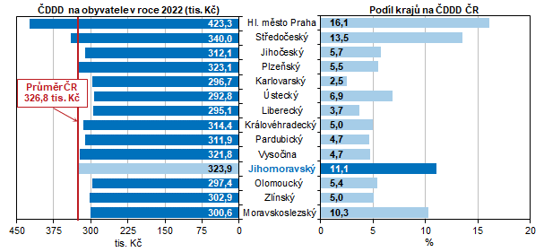Republikový průměr výše HDP na jednoho obyvatele (i ostatní makroekonomické ukazatele) ovlivňuje svou vysokou ekonomickou výkonností hl. m. Praha, a to do té míry, že pod průměrem ČR jsou všechny ostatní kraje. Jihomoravský kraj se u výše tohoto ukazatele řadí na 2. místo v pořadí krajů. Nejnižší hodnota HDP na jednoho obyvatele byla zaznamenána v Karlovarském kraji, a to 377,9 tis. Kč. Karlovarský kraj vykazoval i nejnižší podíl na HDP ČR (1,6 %), naopak Praha se na republikovém celku podílí více než čtvrtinou (28,4 %).