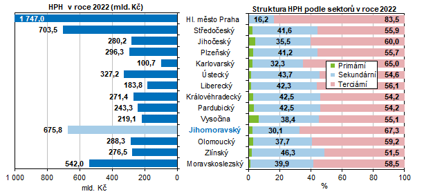 Objem HPH v Jihomoravském kraji byl ve srovnání s ostatními kraji v roce 2022 3. nejvyšší (po hl. m. Praze a Středočeském kraji). V grafu 7 je uvedena struktura tvorby HPH podle sektorů. Jihomoravský kraj je podílem terciárního sektoru druhý nejvyšší mezi kraji a je o 2,0 procentního bodu nad úrovní průměru ČR. Průměr ČR je ovšem ovlivněn hl. m. Prahou, kde podíl činí 83,5 %. Nejnižší podíl terciárního sektoru je zaznamenán ve Zlínském kraji (51,5 %). Primární sektor má nejvýraznější zastoupení v Kraji Vysočina (6,5 %) a v Jihočeském kraji (4,5 %), sekundární sektor ve Zlínském kraji (46,3 %).