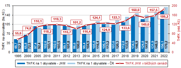 Krajský objem THFK v přepočtu na jednoho obyvatele převyšoval republikový průměr pouze v roce 2003 a v letech 2005 až 2009. V dalších letech byl pod republikovou úrovní, nejvyšší zaznamenaný odstup od republikového průměru byl v roce 2018 (84,2 % průměru ČR). V roce 2022 krajská hodnota THFK ve výši 156,1 tis. Kč na obyvatele zaostávala za průměrem ČR o 14,1 tis. Kč a činila 91,7 % průměru ČR.