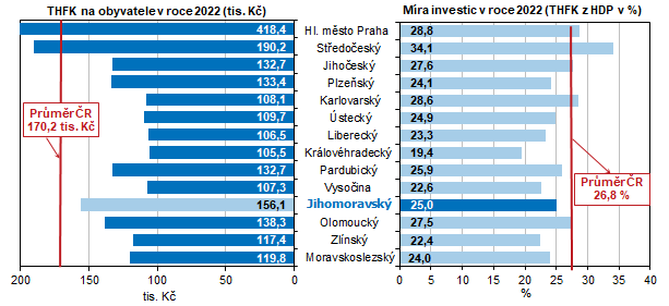 Z pohledu mezikrajského srovnání v roce 2022 byla hodnota THFK na jednoho obyvatele v Jihomoravském kraji mezi kraji 3. nejvyšší za hl. m. Prahou a Středočeským krajem. Tyto dva kraje spolu s Karlovarským, Jihočeským a Olomouckým krajem předčily republikový průměr výše míry investic. Míra investic Jihomoravského kraje byla v mezikrajském žebříčku 7. nejvyšší.