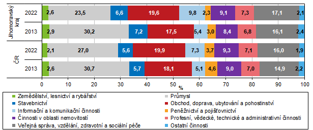 Z grafu 6 je zřejmé, že trend změn v krajské struktuře HPH v roce 2022 proti roku 2013 byl s republikovými změnami podobný ve všech odvětvích. Ke zvýšení podílu došlo v oboru obchod, doprava, ubytování a pohostinství, informační a komunikační činnosti, u činnosti v oblasti nemovitostí, v oblasti profesní, vědecké, technické a administrativní činnosti i v oboru veřejné správy, vzdělávání, zdravotní a sociální péče. Pokles byl zaznamenán v odvětví zemědělství, lesnictví a rybářství, průmyslu, stavebnictví i u činnosti v peněžnictví a pojišťovnictví.