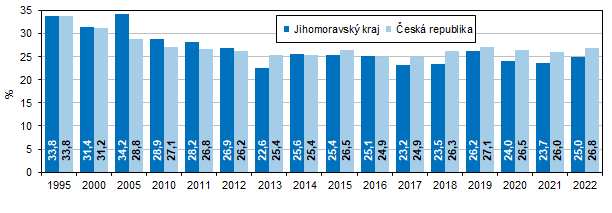 Podíl Jihomoravského kraje na ČDDD republiky byl v minulých letech nejnižší v roce 2003, a to 10,3 %. V letech 2013 až 2016 a 2019 až 2022 byl podíl kraje na republikovém celku na, resp. nad hranicí 11 %. Hodnota podílu v roce 2022 činila 11,1 % a mezi kraji byla 3. nejvyšší.