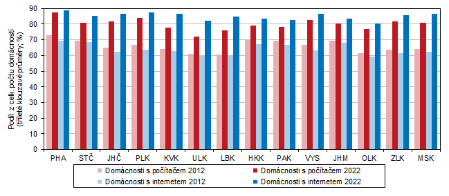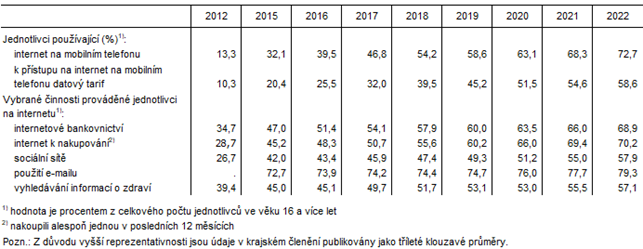 Údaje v tabulce 1 dokládají nárůst podílu jednotlivců s internetem v mobilu – v roce 2022 jím v kraji disponovalo 72,7 % jedinců ve věku 16 let a více, zatímco ještě v roce 2012 to bylo pouze 13,3 %. Výrazně se navýšil i podíl jedinců používajících k přístupu na internet na mobilu datový tarif, a to z 10,3 % v roce 2012 na 58,6 % v roce 2022.